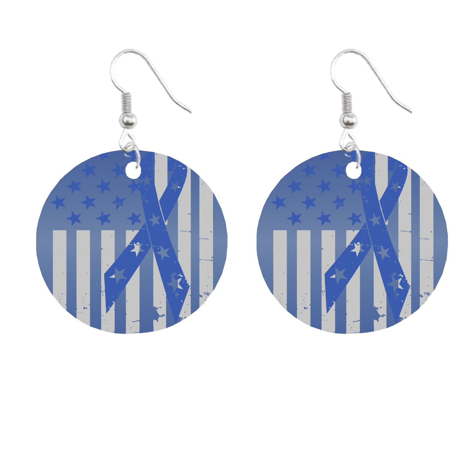 These colorectal cancer awareness flag circle earrings feature a bold distressed flag design with a blue awareness ribbon worked into the artwork for a strong, eye-catching look. They are a powerful way to show support, honor a loved one, or stand proud at awareness rides, benefit events, and community fundraisers.